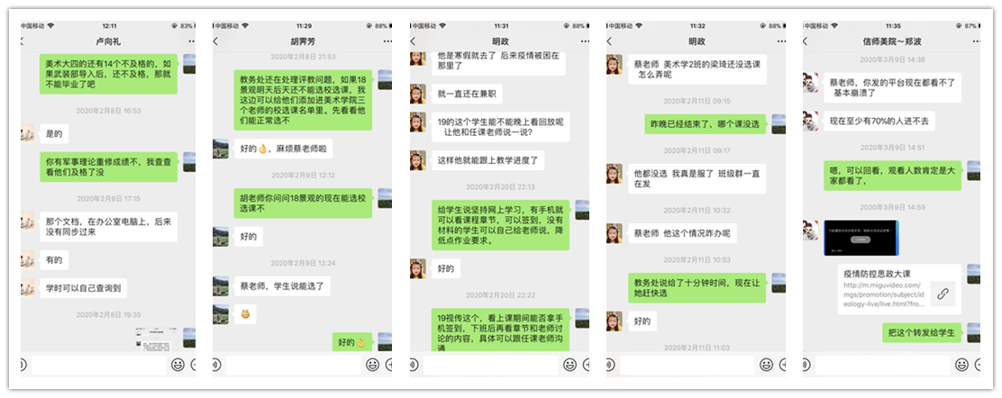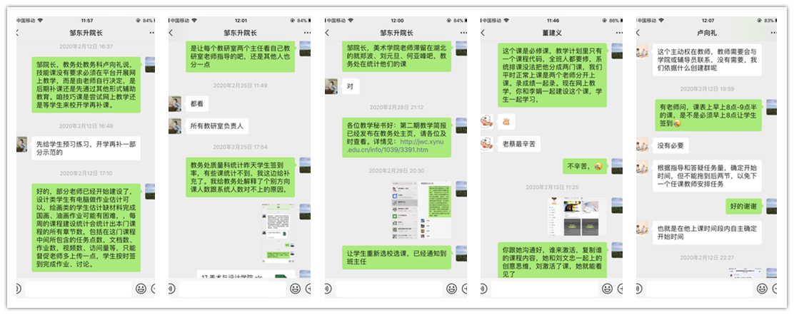 教学秘书蔡森林老师及时向主管教学的邹东升院长和师生传达教务处的各项通知和文件,在邹院长带领下确定教学实施方案、教学质量监控等问题,并及时跟教务处老师沟通网上教学、学生选课、学生成绩等各种问题。网上教学对教师是新事物新挑战,教务处组织超星公司通过网上教学细节视频讲解、微信群、QQ群技术咨询的方式,对全校教师进行了细致的培训,williamhill威廉希尔组织全体教师积极参与培训,参与率为100%,并由蔡老师耐心细致地给老师们解答问题,指导超星网络教学平台和学习通的具体操作,蔡老师提前做功课,有疑问立即咨询超星公司客服人员,对老师们提出的问题做到有问必答,以保证每位任课教师都能顺利高效地开展网上教学。蔡老师对学生选课、网上学习、上学期成绩问题等遇到的各种问题也都耐心细致地一一解答、逐项处理,保证每名学生都积极投入到网上学习中去。