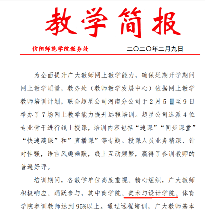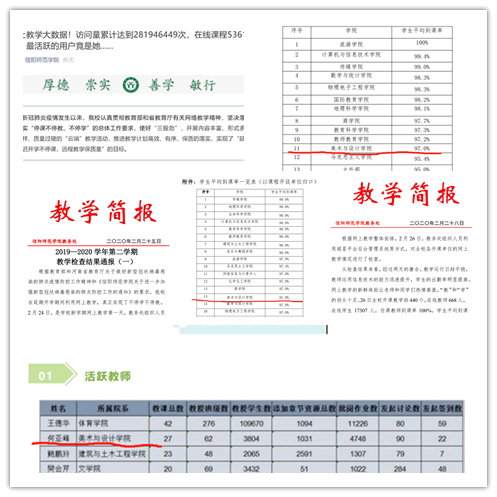 网上教学领导小组认真对照每门课课程教学大纲、教学进度安排的要求,检查督导任课教师网络教学平台上的教学内容建设,通过学生信息员对网上教学的反馈督促教师更积极有效地开展网上教学、在线辅导答疑等工作,实现延迟开学不停课、学生不停学,保质保量地完成教学任务。各系主任指导老师们积极学习网上教学经验,保证教学有序平稳。不断增强课前准备的针对性,提高课程教学的引导性,牢牢把握教学的方向与节奏。网上教学领导小组及时掌握学生学习情况、作业完成质量,做好学生的调查研究,并及时提出整改建议,切实保障教学质量。同时按照毕业论文、毕业创作进度表,组织各系严格审查了毕业论文开题报告、毕业创作初稿,进一步保障论文创作的质量。