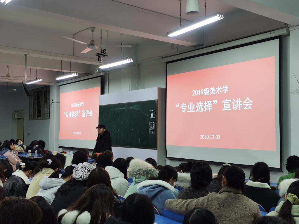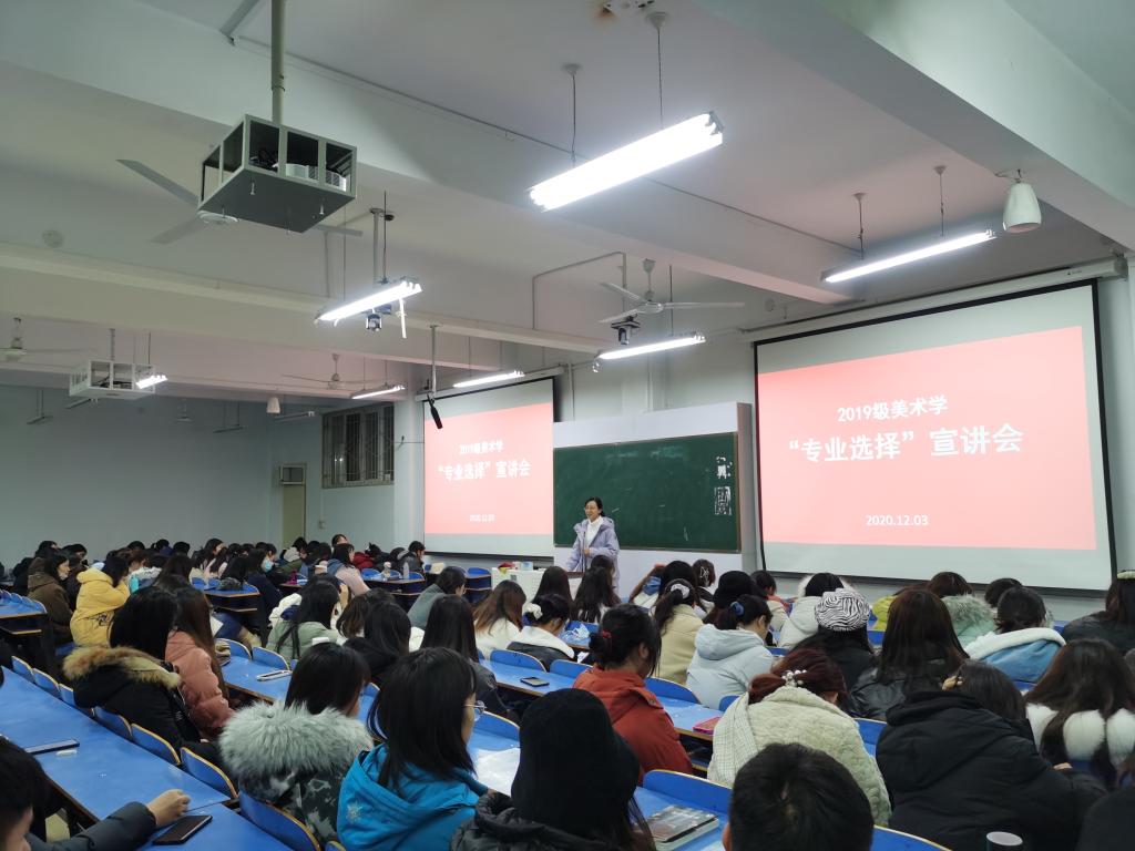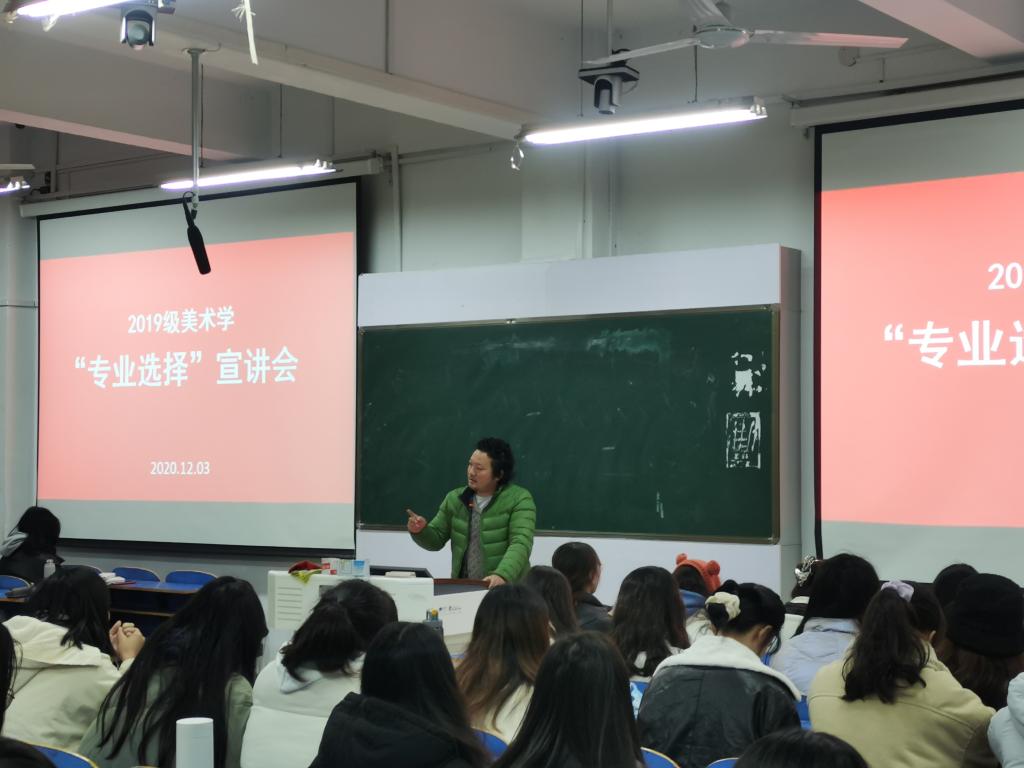 12月3日,2019级美术学班在艺术楼307教室举办了“专业选择”宣讲会,为即将进行专业细分的同学们解疑答惑。2019级美术学全体同学参会,会议由班主任董建义博士主持,油画系主任张江波副教授,视觉传达设计系副主任刘焱老师和国画专业向旭东老师作为特邀教师出席会议。