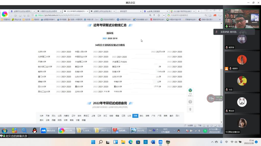 为全面掌握我院考研同学在准备研究生复试过程中存在的困难和诉求,引导同学们进一步明晰考研目标、增强信心和动力,帮助同学们掌握复试和调剂技巧,2月28日下午,我院举行2022年毕业生考研复试与调剂指导交流线上会议。党委书记兰洋,党委副书记周刚,科研与研究生工作秘书刘文忠,毕业生班主任胡霁芳、明政,辅导员饶海虹、郑波参与本次活动。会议由胡霁芳主持,刘文忠讲解。