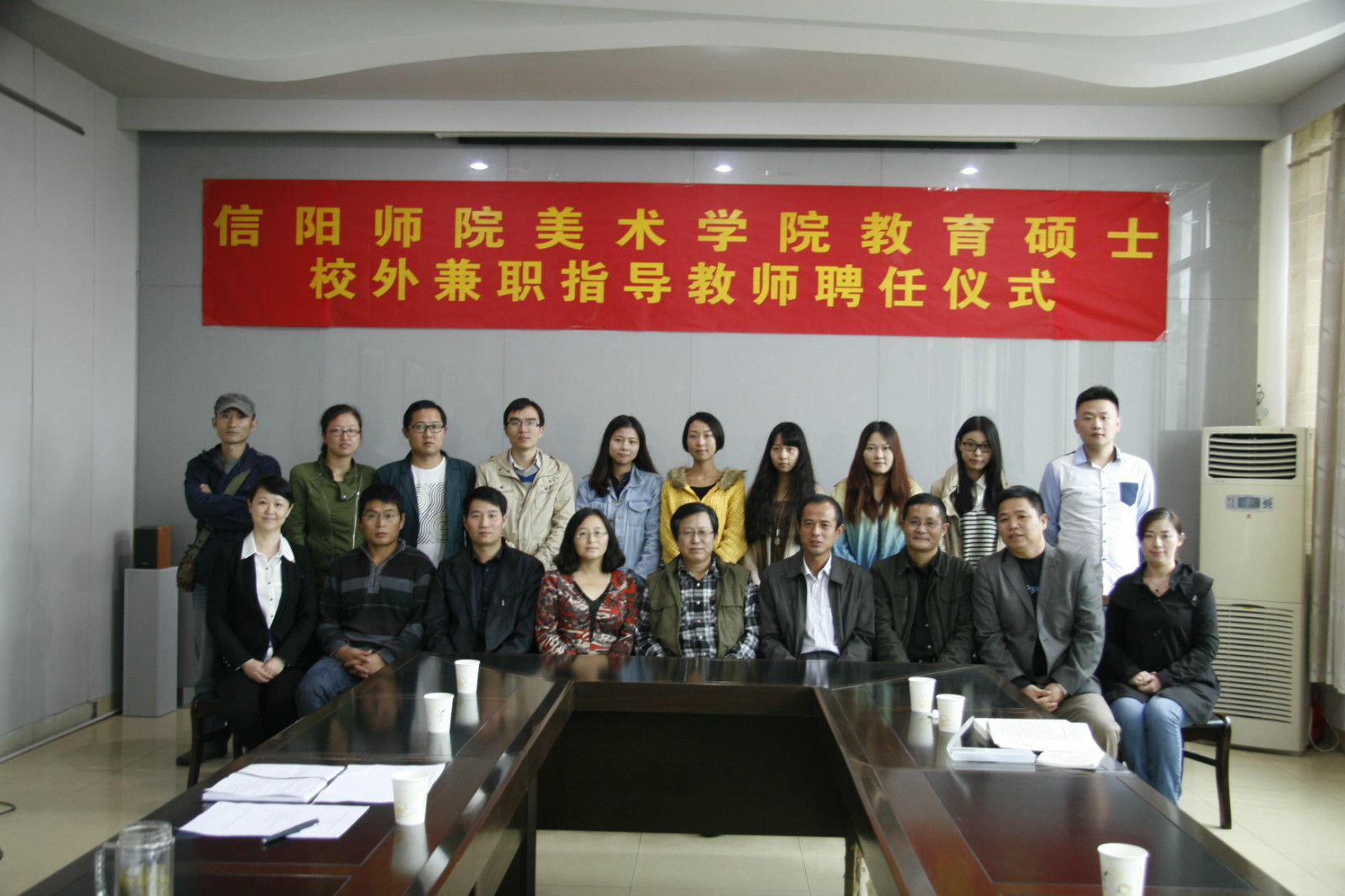 2014年9月18号下午,信阳师范学院美术学院教育硕士校外兼职导师受聘仪式,在美术学院二楼会议室隆重举行。会议由副院长邹东升主持,美术学院院长刘根货、副院长张伟、邹东升,党委副书记李孝民等相关领导和在校硕士研究生共同参加了此次受聘仪式。信阳市第十中学校长也应邀参加了此次会议,并发表了重要讲话。