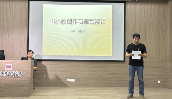讲座伊始,邹东升首先对桂行创的学术成就进行了详细介绍,并对桂老师的到来表示热烈的欢迎和衷心的感谢。随后,桂老师以深厚的艺术造诣和丰富的实践经验,从美术史与中国画的演变、写生与创作、写意三个方面进行了精彩的讲解。桂老师强调,无论是山水还是人物创作,深入了解美术史至关重要。他从展子虔的《游春图》梳理到李思训、李昭道父子的青绿山水,再到陈独秀、胡适、蔡元培等人推动的西洋画改良中国画的历程,使同学们对中国山水画的发展脉络有了清晰的认识。在谈到写生与创作时,桂老师表示,写生是创作的基石,具有独特的魅力。他详细阐述了“外师造化 中得心源”的理念,并分享了个人在写生过程中的心得体会。关于写意,桂老师结合自己的山水画作品,向同学们介绍了水墨技法的运用和艺术哲学的思考,使同学们对山水画创作有了全新的认识和理解。