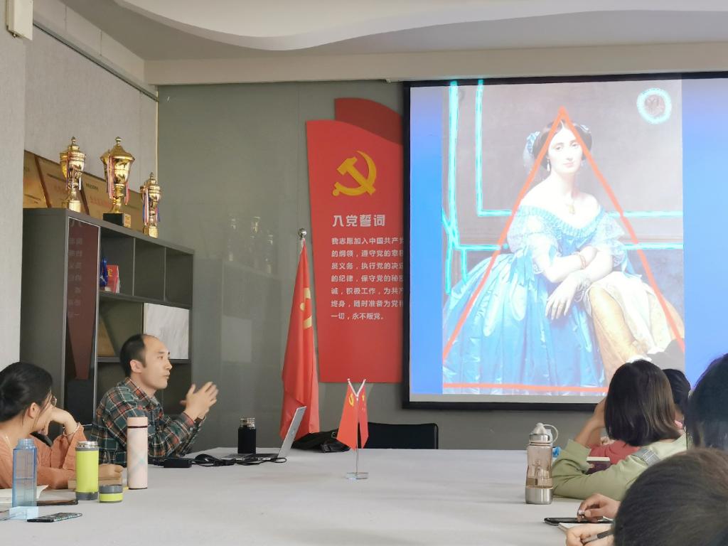 张江波以法国新古典主义画家安格尔的作品《阿尔伯特德布洛格丽公主》为切入点,介绍了油画的发展历程。他指出,不同时期的油画受时代艺术思想的支配和技法的制约呈现出不同的面貌。他详细讲述了油画中线条研究、黑白灰构成关系研究、色块构成关系研究、画面主辅关系研究四个方面。他强调,以解剖学的方式精读经典是我们学习艺术规律的捷径,画面的基本框架结构与形式因素对画面气质和质量有本质的影响,大家要培养主动的画面意识。讲座最后,他列举了大量油画大师的作品,例如梵高《自画像》、波提切利《维纳斯的诞生》、米莱《耶稣基督在父母家里》、克里姆特《吻》、伦勃朗《夜巡》等,并对这些作品进行比较分析和鉴赏。