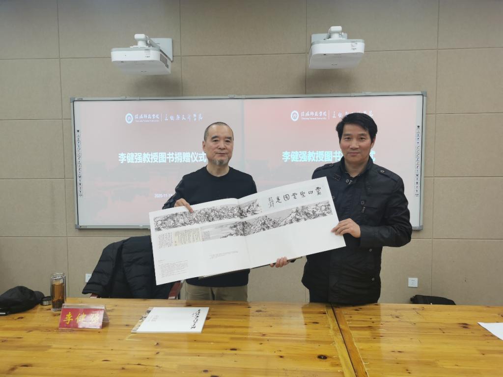 此外,李健强还将自己出版的《寄心闲远--李健强书画集》《李健强唐宋诗写意册》专著赠送给我院收藏,邹东升作为代表接受了赠书,并合影留念。