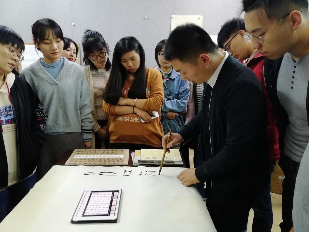 张峰从二重证据法的定义和发展谈起。他指出,二重证据法被认为是20世纪中国考古学和考据学的重大革新,影响深远。之后,他以众多图片为依据,通过文字讲解书法的正确写法:第一用笔,第二识势,第三裹束。三者兼备,然后为书,苟守一途,即为未得。最后,张峰通过现场书写的方式,展示了从小篆、楚简、隶书、草书、楷书、行书的书写特点,同学们纷纷驻足观摩学习。在讲座过程中,张峰幽默风趣的语言,丰富的学识赢得在场同学的一致好评,通过现场教学、互动交流的方式使大家近距离地对书法艺术有了生动直观的了解,增强了学生对于正确书写方式的认识和理解,激励同学们要努力提高自身技能,为今后的学业发展打下坚实的基础。