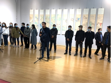首先邹东升老师介绍了本次展览旨在改革中国画学习重构成、轻构图,重形式、轻内容,重材料、轻表达,重制作、轻意境等问题。范本选择清代画家任伯年代表作品《群仙祝寿图》进行教学,原因如下:一是任伯年作为清代画家,集传统绘画精华于一身的代表性人物,其人物画综合了前人历代之精华。二是《群仙祝寿图》结构复杂,线条丰富多变,色彩瑰丽辉煌,造型意向独特,深得中国人尚意精髓。三是12通屏形式便于教学中的团队合作,提升学生之间的协同与互补。学习过程规范学生对于传统人物画的系统学习,使学生掌握传统人物画的线、色、形、意等之间关系及其内涵。明确中国画意象造型观念,保持中国画语言纯粹性、独立性。使审美价值取向回归中国画本体。同时,他又介绍了个人临摹《群仙祝寿图》作为教学范本的一些感悟。最后他充分肯定了学生之间的团结协作,互帮互助,并且表达了对我院全体研究生的期许。