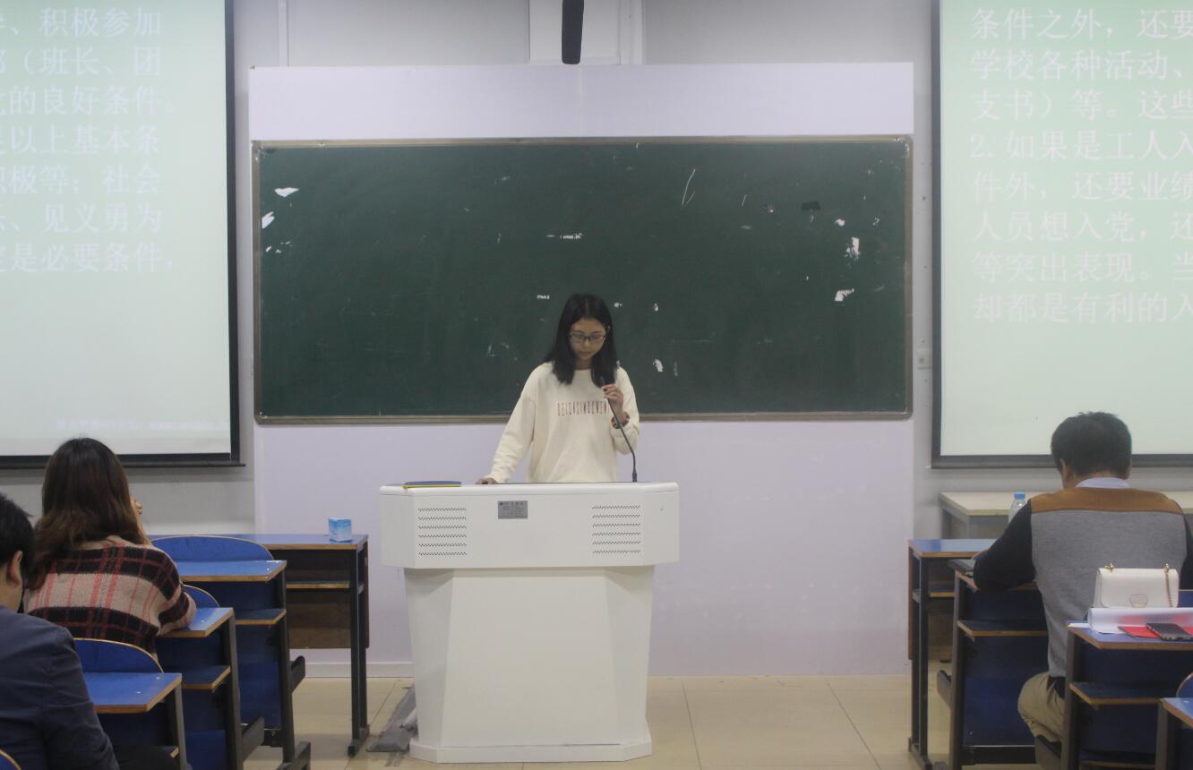 为教育引导党员发展对象学习、尊崇、践行党章,牢固树立党章意识,进一步做到思想入党,4月3日晚,williamhill威廉希尔于艺术楼307室举办“组织入党首先思想入党——我来讲党章”初赛。党支部书记马玉环、杨冰冰,辅导员郑波及本期党员发展对象、入党积极分子共同参与了本次活动。活动由党委秘书饶海虹主持。