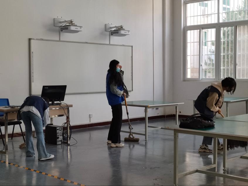 志愿者们分成三队,分别在展厅、实训楼及艺术楼周边进行文明校园实践活动。志愿者们秉承“辛苦自己,服务他人”的理念,携带劳动工具活跃在各个角落,摆放桌椅、打扫卫生、归整电动车文明停放、讲解画展等。在活动中,同学们以饱满的热情和积极的状态,相互配合,投入到劳动中。用自己的实际行动为艺术楼增添一份清新明亮,诠释了全心全意为人民服务的精神。