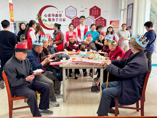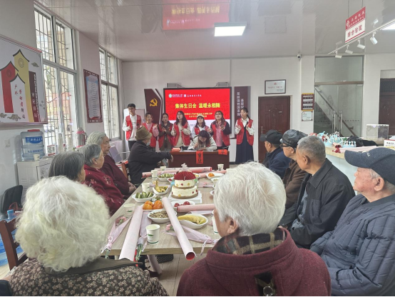入党积极份子姜一帆同学为大家带来了独唱《红星歌》,激昂的旋律让现场气氛更加热烈。接着,所有志愿者共同上台献上歌曲《你笑起来真好看》,欢快的歌声让老人们脸上洋溢着愉快的笑容,在场所有人热情高涨,一起跟唱,现场一片欢乐。最令人期待的切蛋糕吹蜡烛环节将活动推向了高潮。志愿者们给老人戴上寿星帽、送上蛋糕、鲜花和书法作品。最后,大家齐唱《祝你生日快乐》,再次给老人们送上美好祝愿。