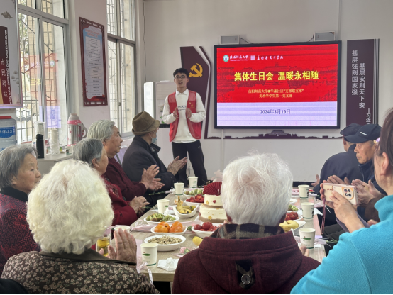 为将“支部联支部”工作推向深入,增强党员教育的时代性、先进性。3月19日,我院美术学学生第一党支部书记郑波带领支部8名志愿者赴华森社区成功开展“集体生日会温暖永相随”爱老敬老活动及清洁社区志愿服务活动。集体生日会由海竞文主持,共有12名社区老人参加。