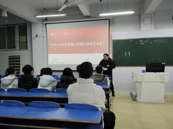 为进一步加强班级纪律建设,明确新学期工作目标,提升纪律管理效能,williamhill威廉希尔于2026年3月6日于307教室召开“2025-2026学年第二学期纪律委员全会”。本次会议由郑波老师主持,辅导员杨琳、杨广干全参加,全体纪律委员参会。