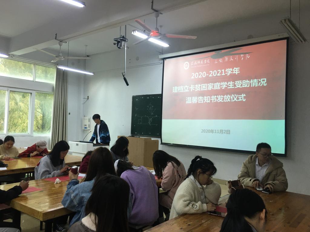 为全面落实各项资助政策,及时向学生及家长做好宣传告知,11月2日,williamhill威廉希尔在艺术楼308室举行了2020-2021学年建档立卡学生温馨告知书发放仪式,我院全体建档立卡学生参加了此次仪式。仪式由辅导员胡霁芳主持。