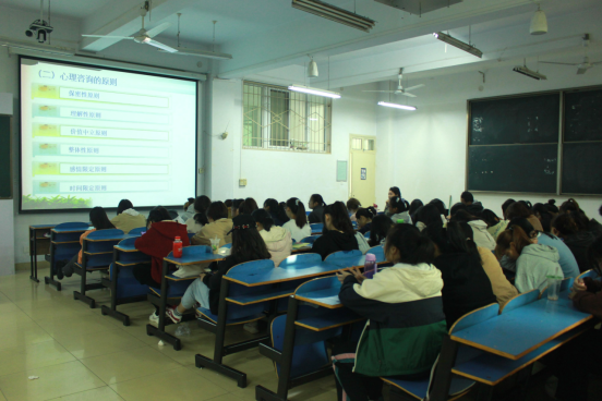 课堂上,胡霁芳向同学们详细普及了大学生心理健康基础知识,并结合相关实例和视频进行具体分析,帮助同学们更直观、更深入地了解心理问题。胡霁芳向同学们强调,在保持浓厚的学习氛围的同时,也要保持乐观的情绪和积极的心境,对未来充满信心与期待,掌握心理调节的方法,提高心理承受能力。最后,她向同学们宣传心理咨询的过程与积极作用,对如何预约我校心理健康咨询进行补充说明。