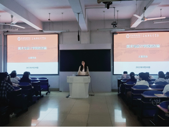 为提升学生防范电信网络诈骗意识,加强学生安全教育,9月30日晚,我院在艺术楼307教室召开预防电信网络诈骗主题班会。新生班主任胡霁芳及全体学生参加了此次会议,会议由胡霁芳主持。