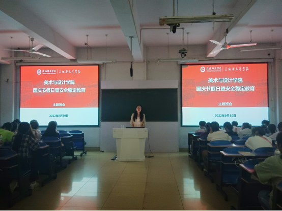 2022年9月30日,我院在艺术楼307召开国庆节假日暨安全稳定教育主题班会,本次班会围绕国庆假期疫情防控工作、假期安全注意事项展开,旨在提高22级新生的安全防疫意识,新生班主任胡霁芳主持此次班会,2022级全体新生参与。