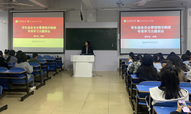 为了培养学生的安全责任感,营造出秩序良好、文明和谐的宿舍文化氛围,9月17日晚,我院于艺术楼307召开了学生宿舍安全管理相关制度专项学习主题班会。本次班会由新生班主任杨琳主持,2023级全体新生共同参加。
