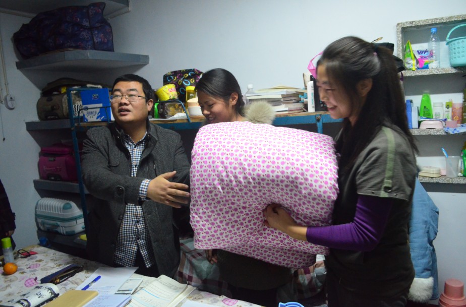 11月29日晚,美术学院团总支学生会骨干成员在该院团总支书记周贤亮的带领下前往学生宿舍为有需要的学生送去棉被、褥子等御寒物品,并对美术学院各个宿舍进行了安全卫生排查。