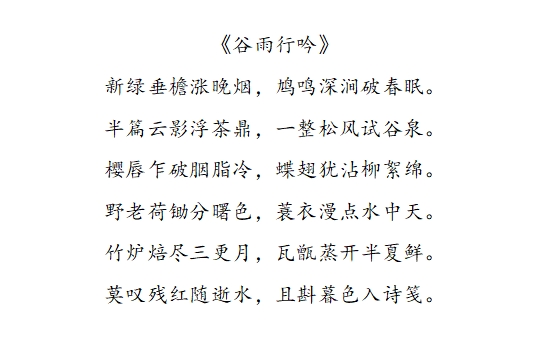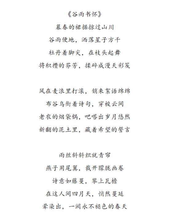 为传承弘扬传统节气文化,引领学生感受谷雨节气的独特风韵,4月12日至15日,我院学生会学术科技部于线上举办“暮春逢谷雨,诗意落人间”诗歌创作活动。