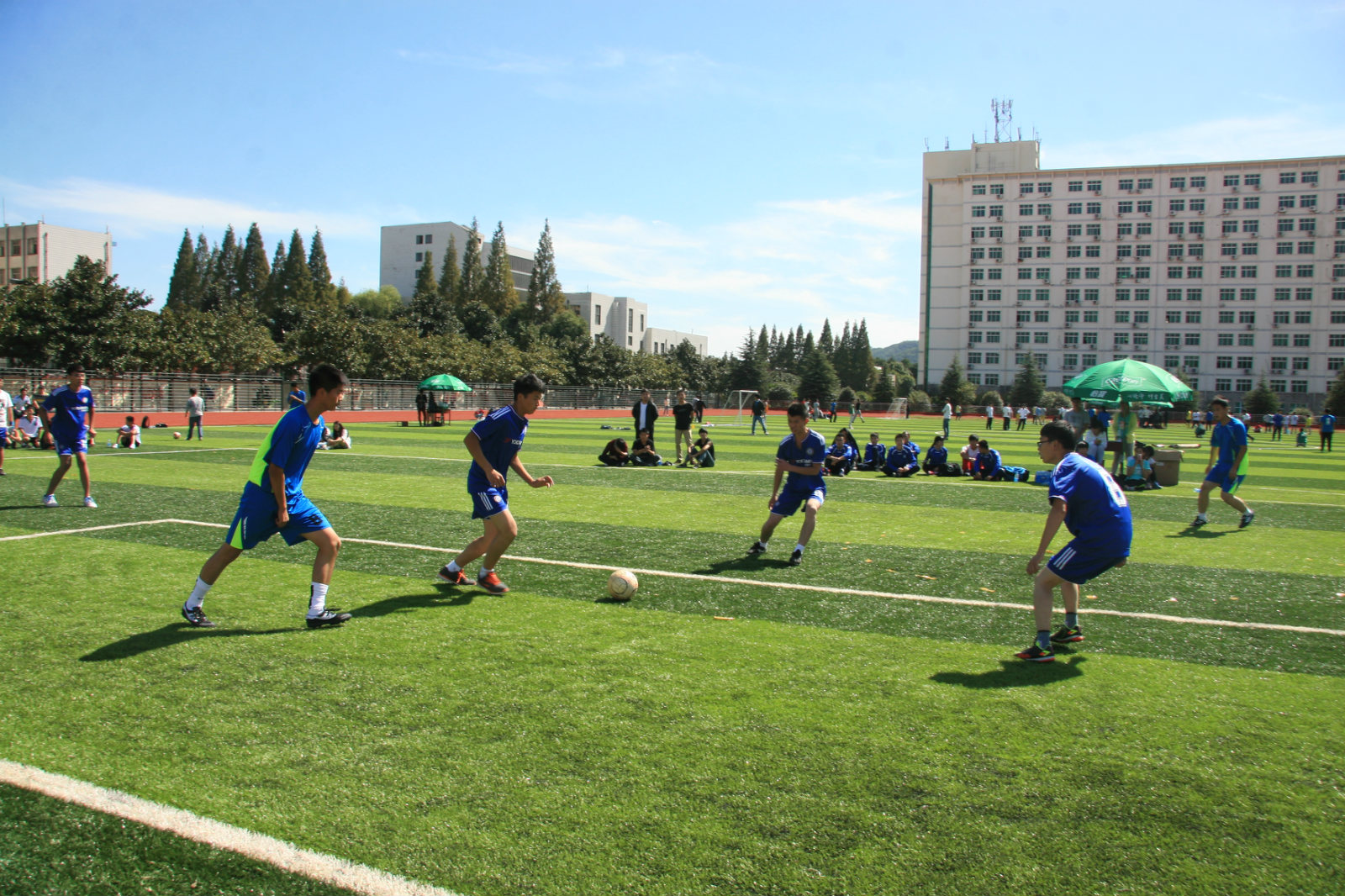 万里晴空,阳光正好,我院与体育学院首场交锋。赛前各队队员积极做好充分的热身准备,讨论作战布局。比赛正式开始,双方队员迅速进入状态,随即展开激烈的角逐。我院队员配合默契,巧妙传球,展现了队员们精湛的球技。虽然体育学院的队员比我院队员的实战经验丰富,但我院队员坚持不懈,顽强拼搏,全力拦截。双方队员你追我赶,不相上下,赛场上充斥着紧张的氛围。扣人心弦的比赛让现场的观众目睹了场上队员的实力,感受到了足球的魅力。