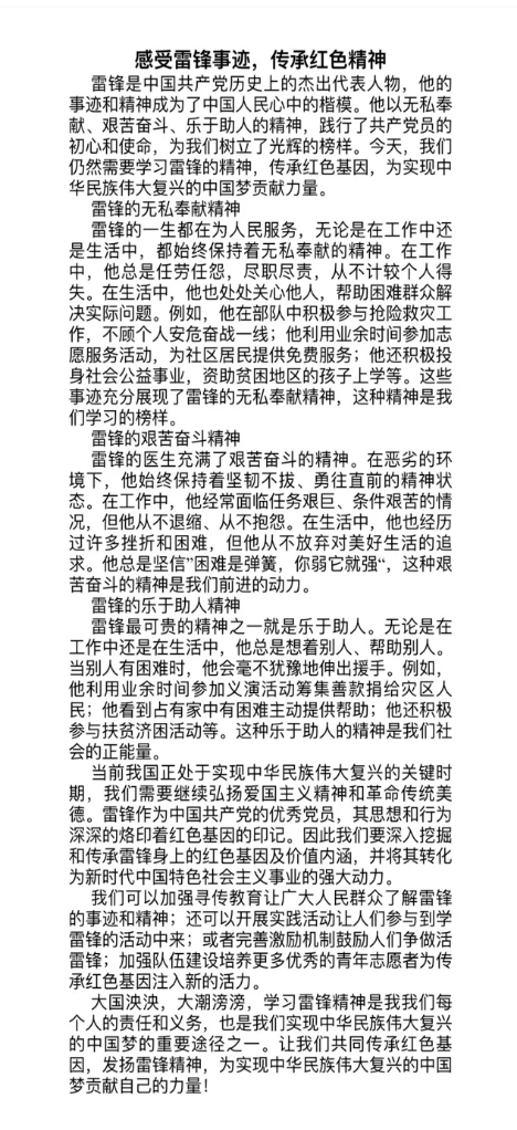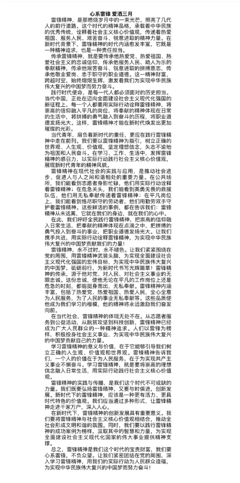 此次活动一经推出,便吸引了众多同学的积极参与。同学们纷纷拿起笔杆,用真挚的情感书写雷锋精神,用文字表达他们对雷锋精神的崇敬与传承。一篇篇征文作品,不仅展现了同学们出色的文学才华,更体现了雷锋精神在青年学子心中的巨大影响力和号召力。