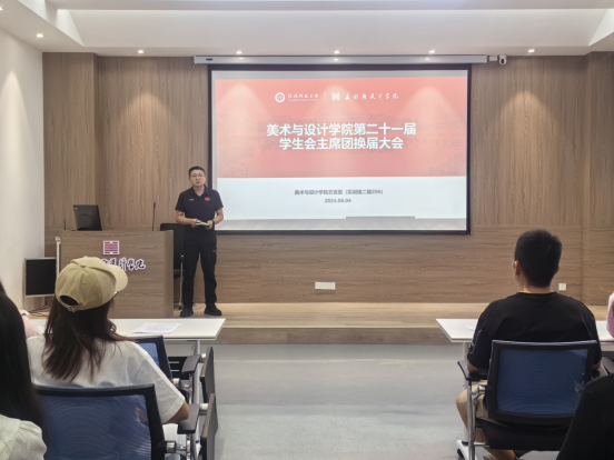 6月4日,我院第二十一届学生会主席团换届大会于艺言堂召开。我院党委副书记周刚,辅导员郑波、杨琳及第二十届学生会主席团担任大会评委,学生会全体成员共同参与。会议由第二十届学生会执行主席孔帅主持。