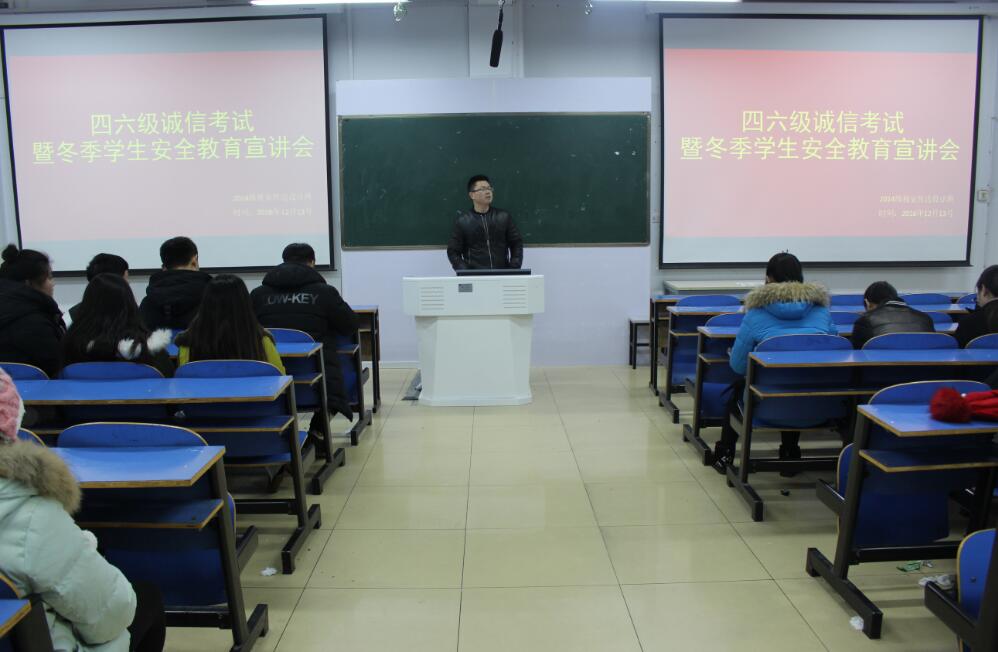 为树立优良的学风和校风、提高学生安全防范意识,12月13日晚,williamhill威廉希尔在艺术楼307室召开四六级诚信考试暨冬季学生安全教育宣讲会,我院14级视传班学生参加了此次会议,会议由我院辅导员张锐主持。