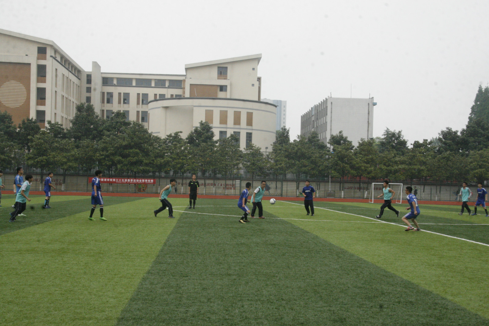 尽管天空中飘着细雨,但这并不能阻挡双方队员的热情。随着裁判的一声哨响,比赛正式开始,我院队员抢得先机,以细腻的脚法,凶猛的进攻,使得计算机学院队员有些被动。双方在进行了将近半个小时的激烈角逐后,美术学院赢得了一次破门。随后,对方展开更加严密的防守和机警的进攻,但在我院队员的齐心协力下,成功突破防线,又进一球。上半场比赛以2:0比分结束。短暂休息后,计算机院对我院展开多次激烈的进攻,并进一球。随后,我院队员积极调整战略,终于寻到对方漏洞,连进3球。最终,我院领先4分,大获全胜。