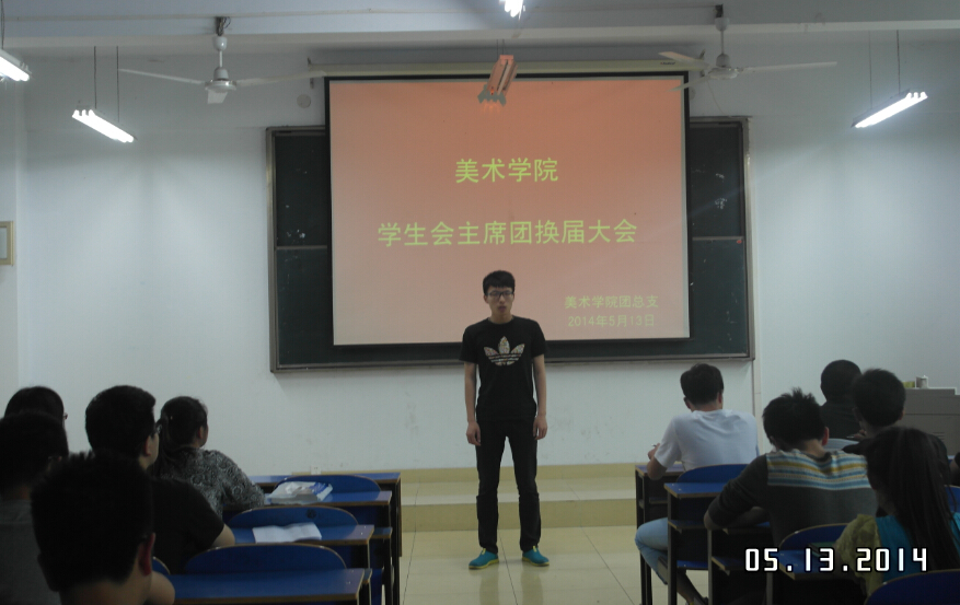 5月13日,美术学院2014年学生会主席团换届大会在艺术理论307顺利召开,美术学院团总支书记周贤亮及第十届学生会主席团成员担任大会评委,学生会全体成员共同参加了此次大会。