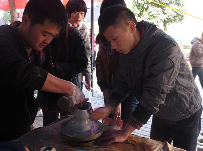 揭秘陶艺制作方法,追寻国粹古老魅力。11月17日,由美术学院大学生艺术设计协会主办,华锐学院设计绘画爱好者协会协办的“探寻陶艺古老魅力”制作展在逸夫楼前如期举行。该院团总支书记齐东伟、专业指导老师董建义应邀参观指导,近两百余名陶艺爱好者在现场学习制作。