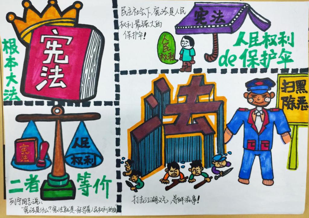 活动伊始,参加者通过A4纸大小进行本次作品的绘制。本次活动要求学生熟知征集内容,把握设计理念。整体构图简洁大气、庄严厚重、醒目美观,且具有纪念和激励成长意义。活动中同学们积极参加,并按照要求完成作品。作品中都充分体现着同学们积极学法、用法的向上精神。活动最后,将选出的优秀作品进行展示并保存。