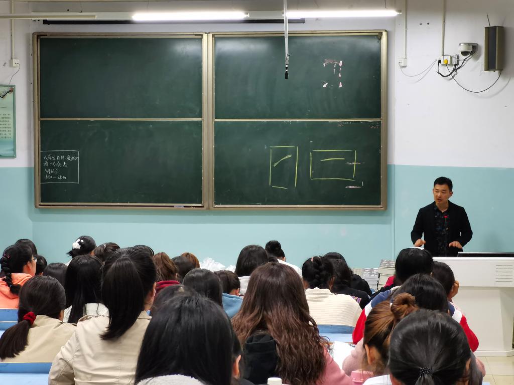 最后,张峰老师代表社团热烈欢迎同学们的到来,用风趣幽默的讲解了从古至今的书写方式变化,对书法进行了传统意义上的解读,将不同字体进行了介绍、比较,重点强调用笔方式与技巧。还为同学们讲解了书法新的知识,新颖有趣还充满历史文学,鼓励从未接触过的同学大胆尝试,用点滴积累来发展自己的另一特长,在不断学习中充盈自己,现场氛围十分活跃。