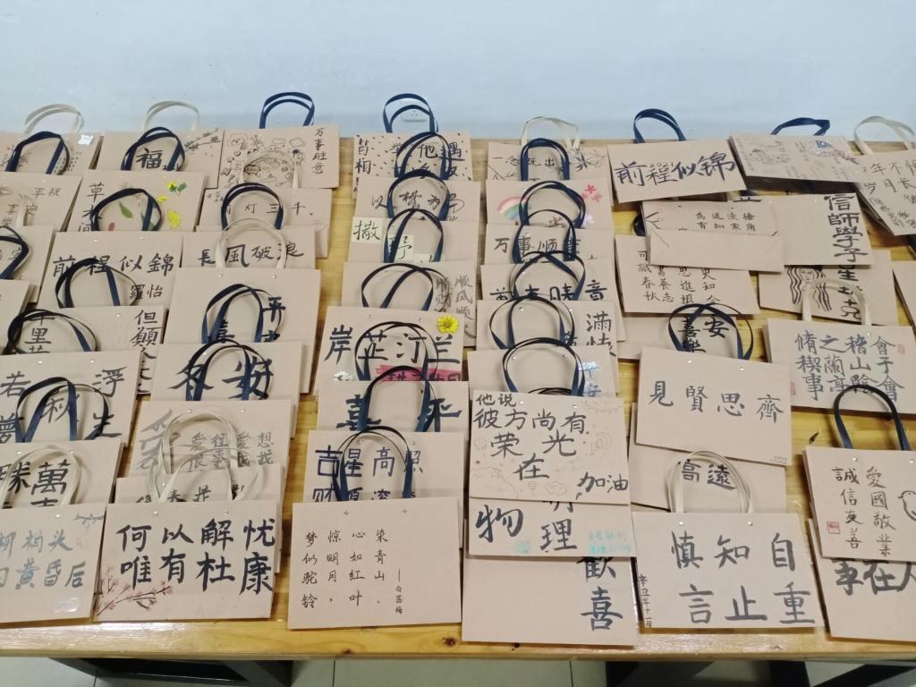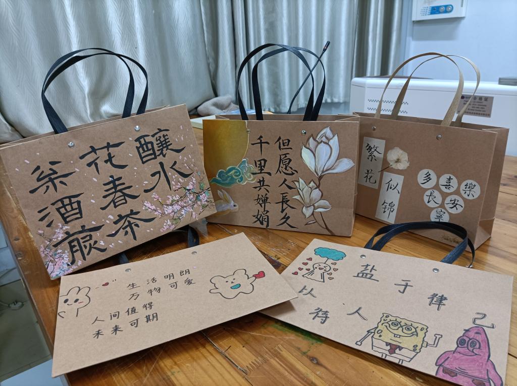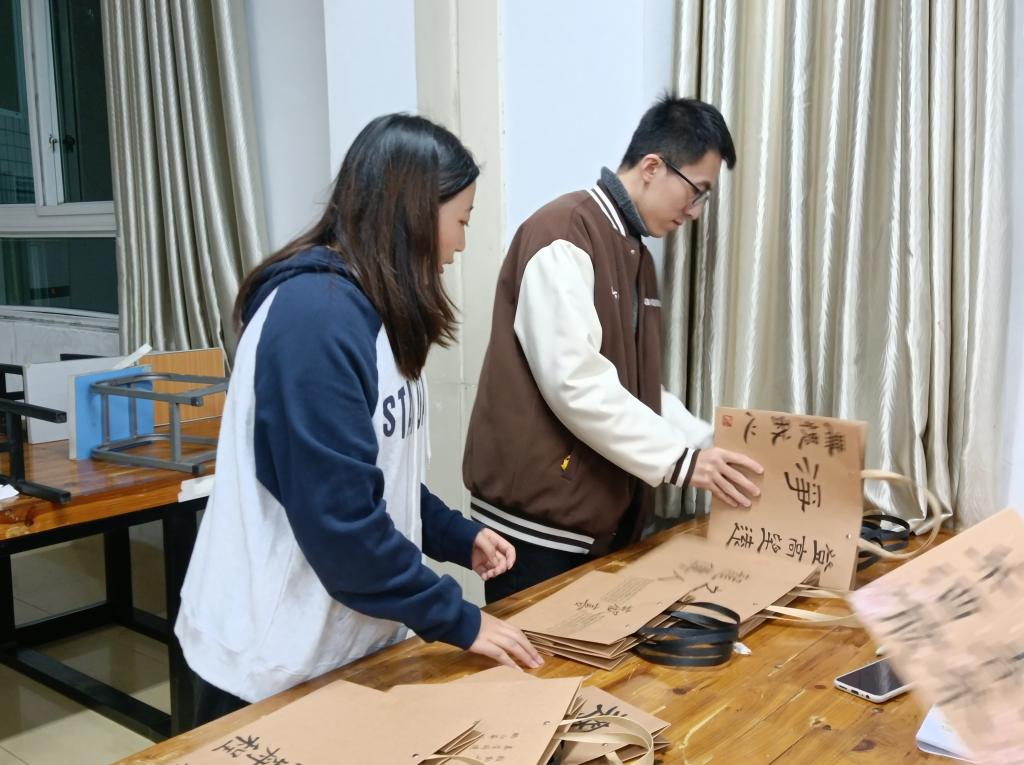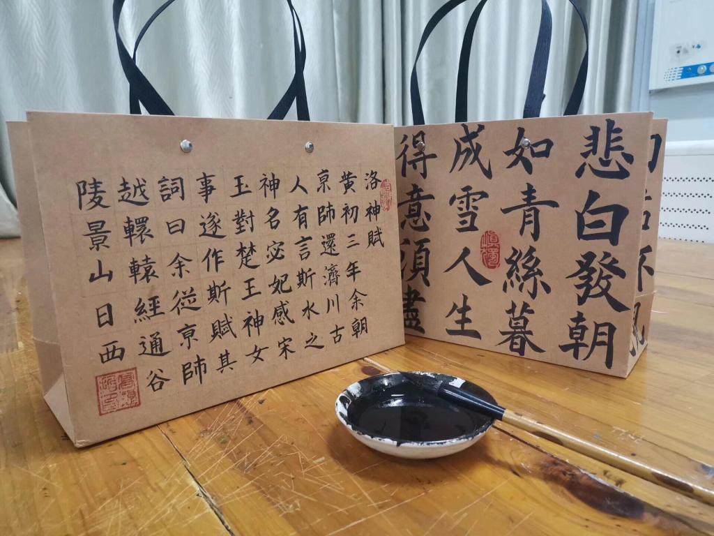 活动伊始,工作人员提前将场地布置好,便于参赛人员领取物品,进行作品创作,并告知活动要求,规范活动形式。同学们豪情挥墨,尽展才华,作品涉及的题材丰富,呈现出笔力挺劲的行书、方圆相济的篆书、端庄严谨的隶书,浑厚有力、收放有度、风格鲜明,令人赞不绝口。其中,更有用丹青点染创作的手法,新颖有趣。一个个DIY书法联名环保纸袋饱含同学们的创意以及深厚的书法底蕴。本次参赛作品交由专业的评审团进行筛选最终评选出一等奖3名,二等奖5名,三等奖12名。