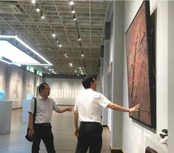 董建义介绍了学院的基本情况,并陪同参观了学院的艺术展厅红色专题展览及研究生工作室、教室等。石品校长对我院近年来的快速发展取得成绩充分肯定,特别是对我院充分利用信阳红色资源,进行主题美术创作以及在美术届展中取得的优异成绩给予高度赞赏,并就下一步双方在美术设计的人才培养、艺术创作、产学研结合等方面的合作,进行深入交流,希望双方加强联系,优势互补,实现双赢。