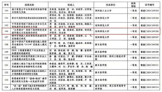 近日,河南省教育厅了发布《关于公布2024年度河南省高等教育教学成果奖获奖项目名单的通知》(教高〔2024〕363号),我院教师高正主持“‘五育融合’视域下的高师院校美育教学模式与实践路径研究”荣获2024 年度河南省本科高等教育教学成果奖一等奖。