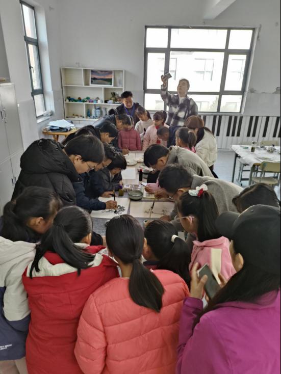 9时30分,书画演示正式开始。我院教师们现场挥毫创作,实时讲解构图思路、笔墨技法与意境营造技巧,解答工具选择、色彩搭配等疑问,并向学校赠予多幅兼具艺术价值与教育意义的作品。
