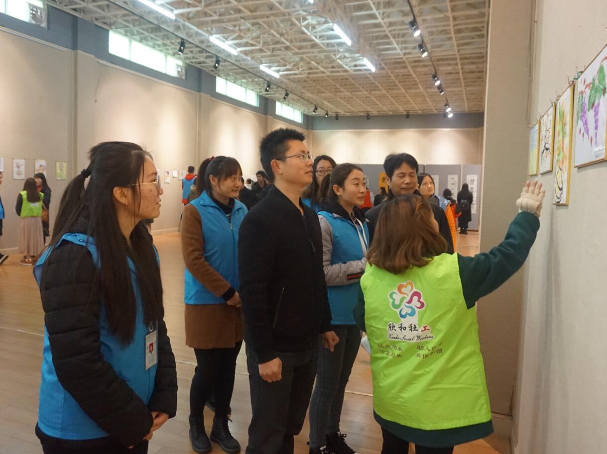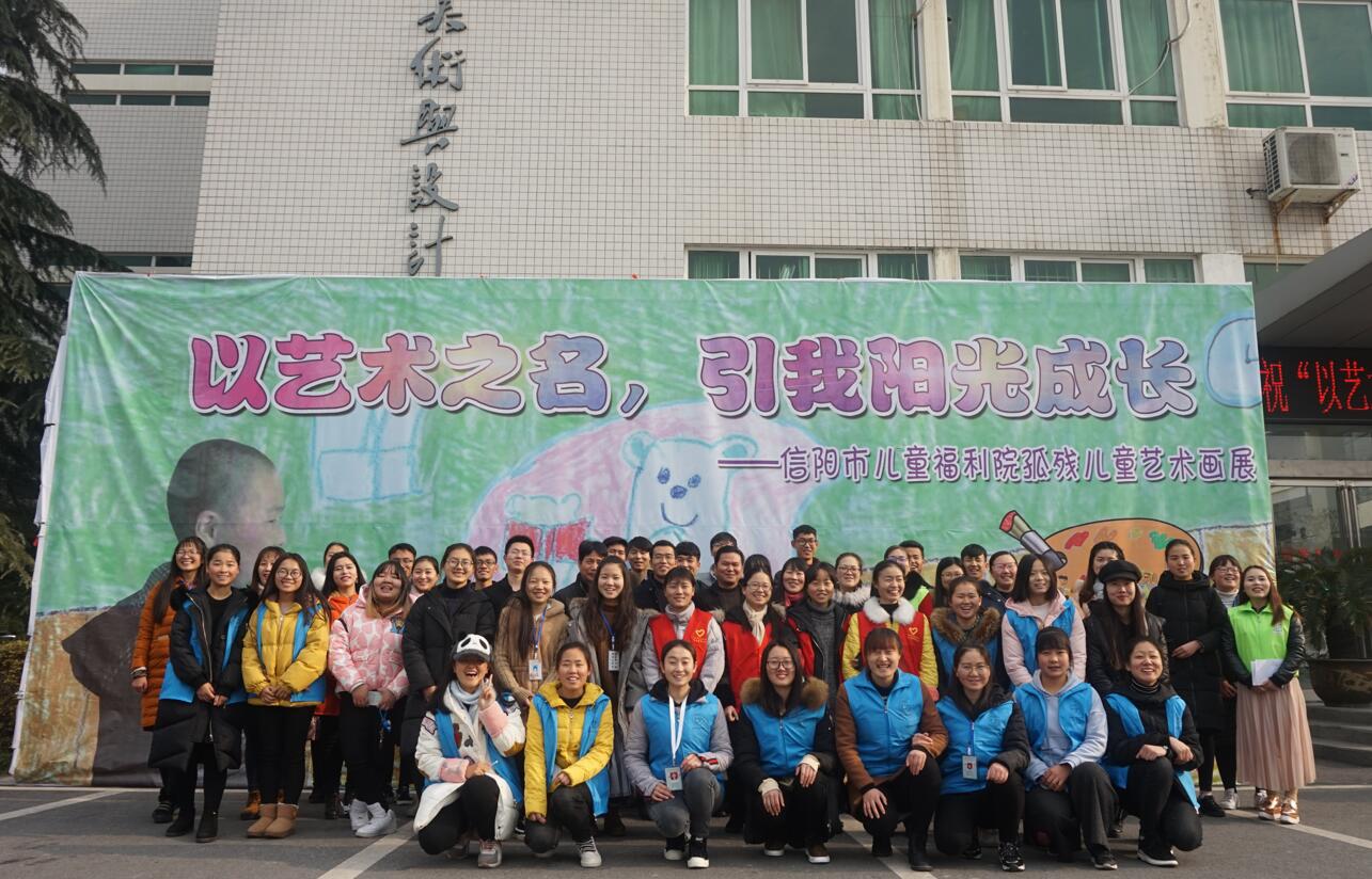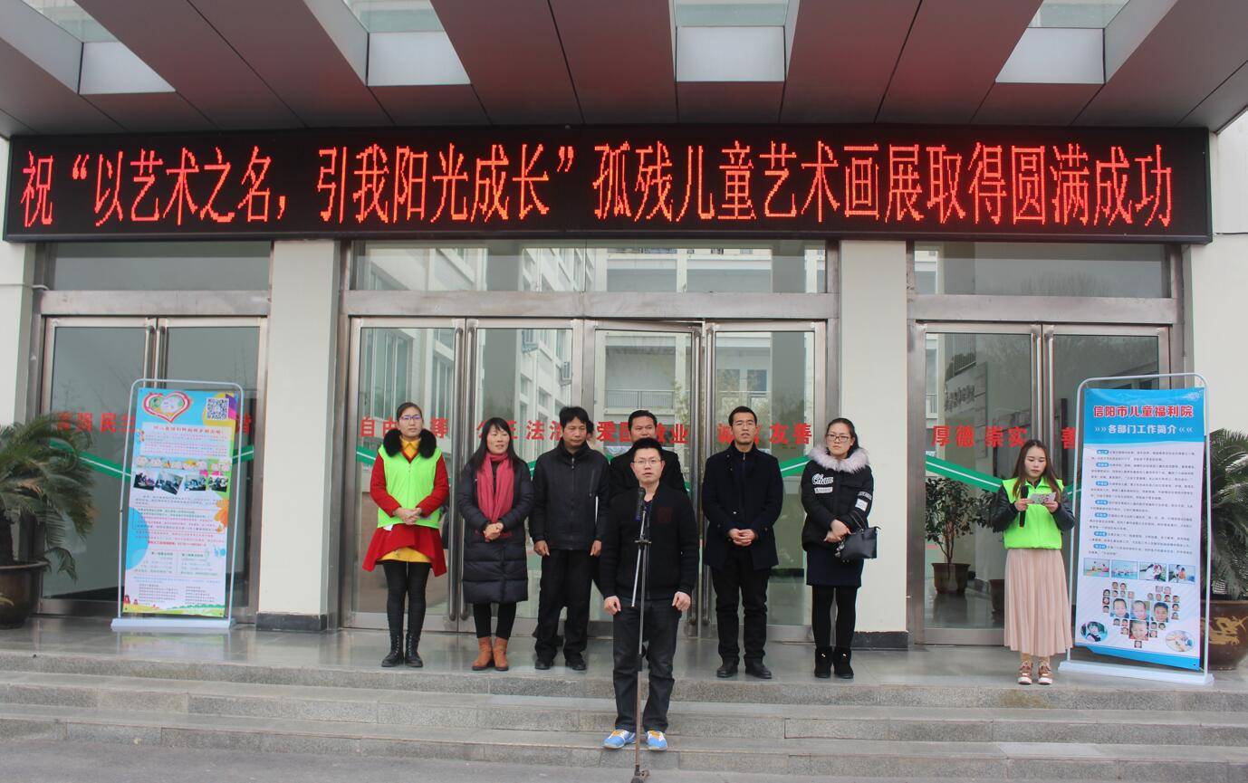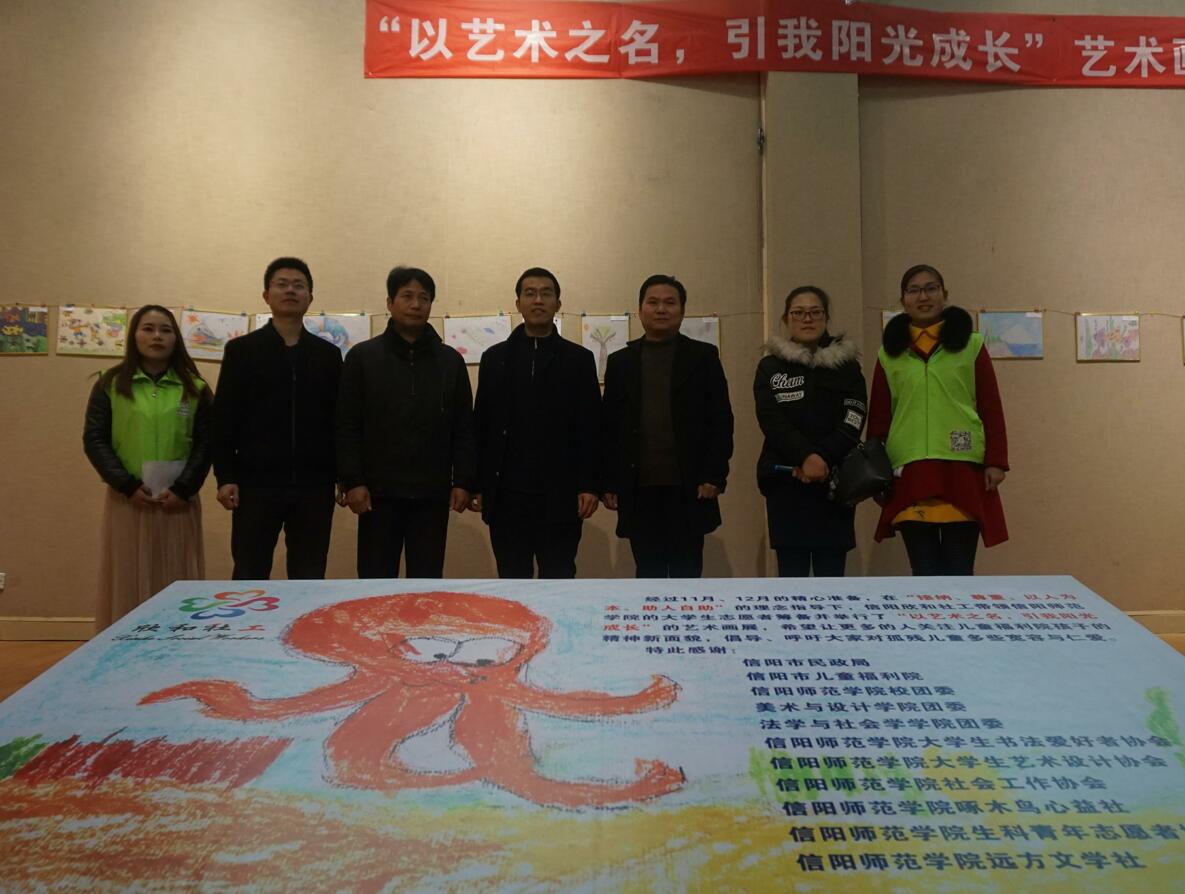 为呼吁广大师生关爱弱势群体传递爱与温暖,12月23日上午,由信阳市儿童福利院和信阳欣和社工主办,信阳市民政局、信阳市儿童福利院、信阳师范学院校团委、williamhill威廉希尔团委、法学与社会学院团委、信阳师范学院社会工作协会、信阳师范学院大学生书法爱好者协会、信阳师范学院大学生艺术爱好者协会、信阳师范学院啄木鸟心益社、信阳师范学院生科青年志愿者协会、信阳师范学院远方文学社共同承办的“以艺术之名,引我阳光成长”孤残儿童艺术画展在艺术楼隆重开幕。信阳师范学院团委副书记朱国朋、法学与社会学学院副院长贾义保、法学与社会学学院团委书记袁艳红、williamhill威廉希尔团委书记张锐、地理科学学院团委老师姚玉坤、信阳市福利院院长余新再以及百余名学生出席开幕式。开幕式由志愿者李亚楠主持。
