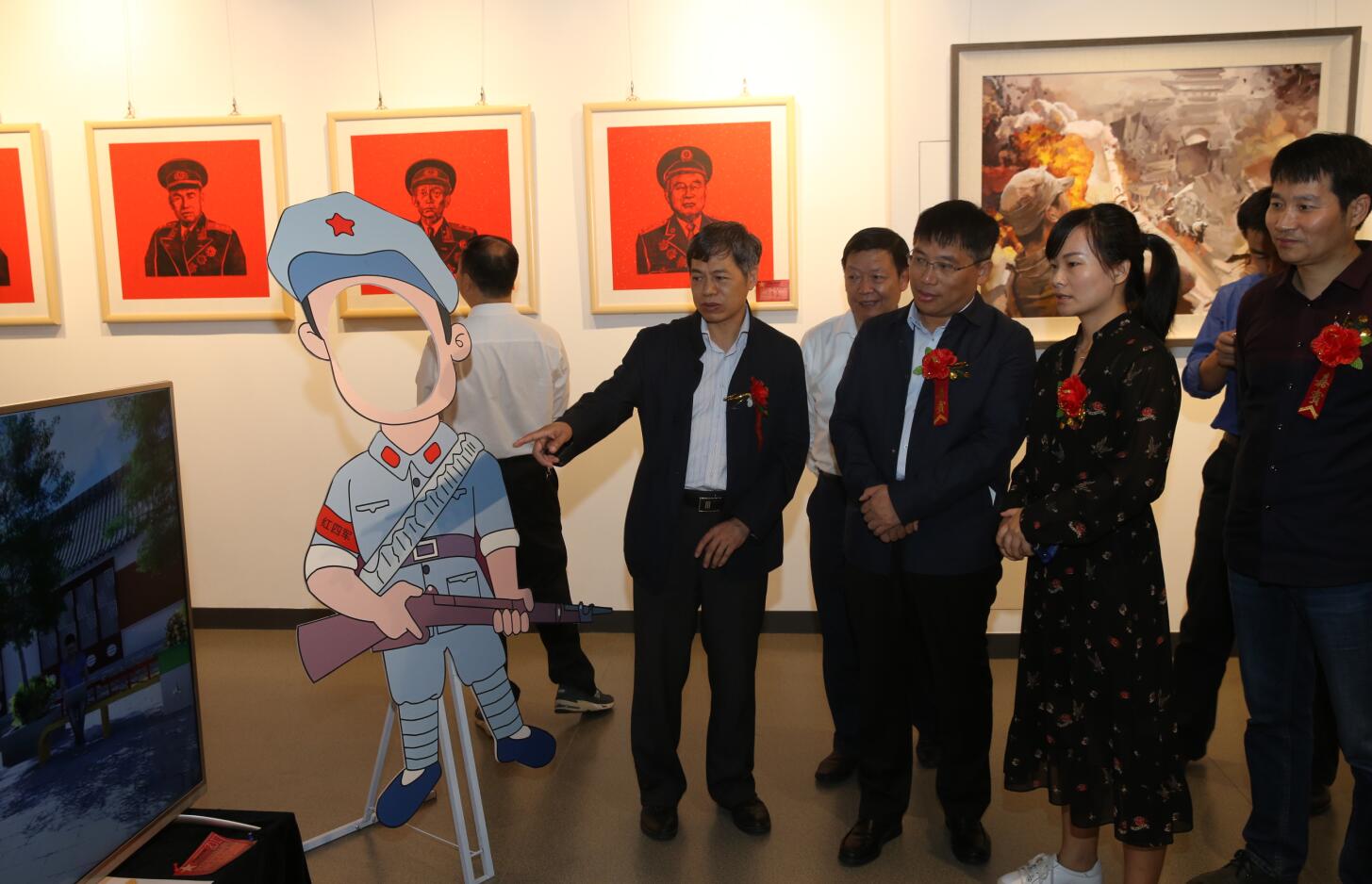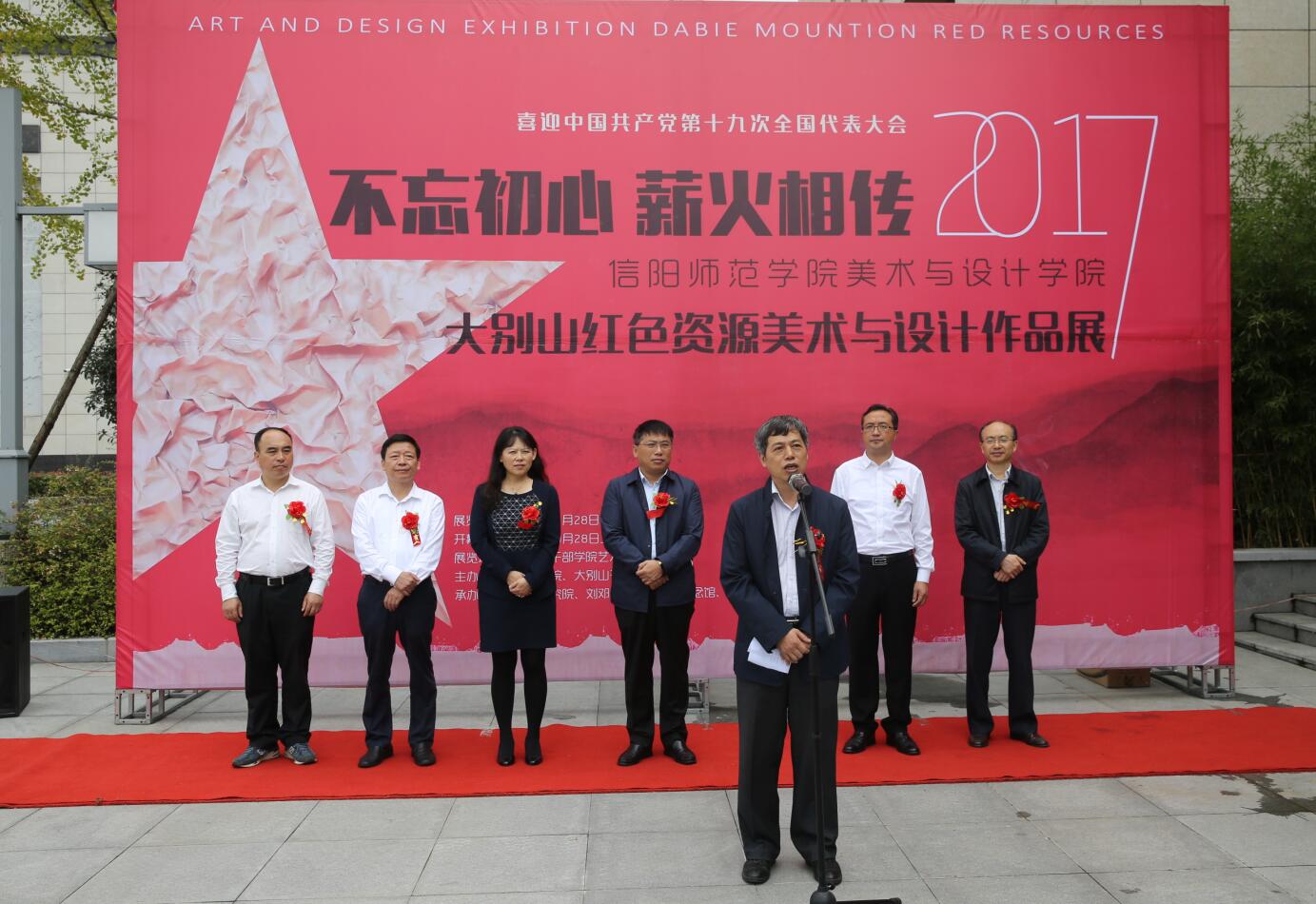 9月28日,由信阳师范学院、大别山干部学院主办,信阳发展研究院、刘邓大军千里跃进纪念馆、williamhill威廉希尔承办的喜迎中国中产党第十九次全国代表大会,大别山红色资源美术与设计作品展于新县大别山干部学院展厅隆重开幕。信阳市委常委、市委秘书长、常务副市长王新会,信阳师范学院校长李俊教授,信阳市委副秘书长姜红,新县县委副书记、大别山干部学院党委副书记林志成,大别山干部学院副院长孙伟,信阳师范学院校长办公室主任李益民,信阳师范学院发展规划处处长单刚,信阳师范学院williamhill威廉希尔副院长邹东升及信阳市2017年秋季学期处级、乡科级任职班学员和信阳师范学院williamhill威廉希尔红色创作团队成员等二百余嘉宾共同参加了开幕式。开幕式由williamhill威廉希尔张伟副院长主持。