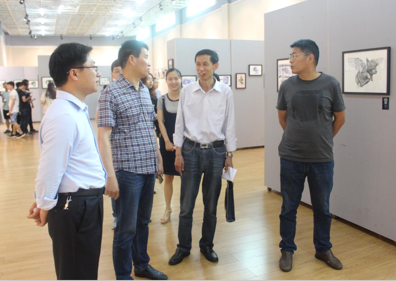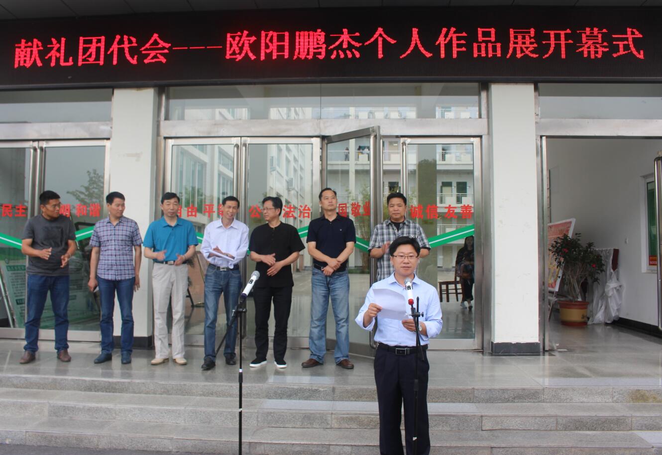 开幕式上,杨轶中首先对欧阳鹏杰个人作品展的基本情况作了简单介绍。随后岳宗德致开幕词,他对欧阳鹏杰在校期间潜心钻研绘画技巧、不断创作及毕业后不忘初心、追逐梦想,以身示范的精神给予了高度评价,并激励学子们以欧阳鹏杰为榜样,坚持梦想,努力学习,不断完善和提高自身的绘画技巧,创作出更多更优秀的艺术作品。欧阳鹏杰对我院的邀请以及大力支持本次展览的举办表示了感谢,他表示本次展览的举办是源于自己大学入学初的梦想,可以在毕业后举办是一个难得而宝贵的机会。他表示只要坚定信念、找准方向、脚踏实地,梦想总是会实现的,在之后的日子里他依旧会为圆珠笔画的推广尽自己一份力量。随后耿劲松主任宣布欧阳鹏杰个人作品展开幕。