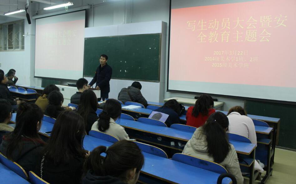 根据教学大纲安排,williamhill威廉希尔计划组织14级、15级美术学专业学生于3月27日赴西安开展为期两周的写生活动。3月22日下午,我院领导教师在艺术楼307室召开14级、15级写生动员会暨安全教育大会。我院党委书记刘根货,副院长邹东升,团委书记张锐,写生带队教师锁武通、张涛等,班主任施远、张峰及近二百名学生参加会议。会议由我院党委副书记杨轶中主持。