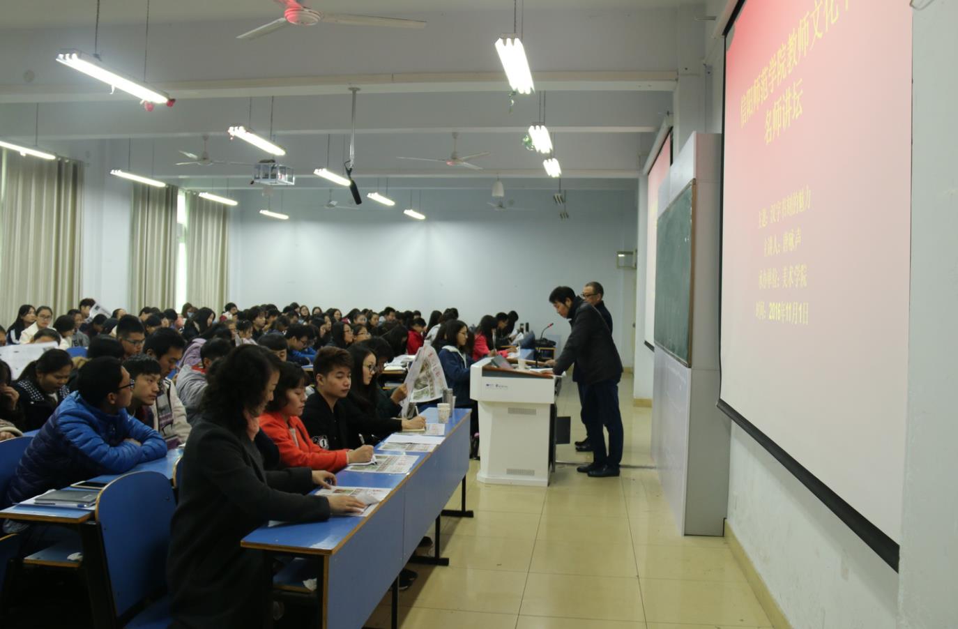 11月1日上午,由williamhill威廉希尔承办的2016年教师教育文化节名师讲堂“汉字书刻的魅力”讲座于艺术楼307室开讲。中国书法家协会会员、河南省书法家协会篆刻专业委员会委员、河南印社理事唐咏声做客美术学院,为我院两百余名师生带来了精彩的一课。本次讲座由我院副院长邹东升主持。
