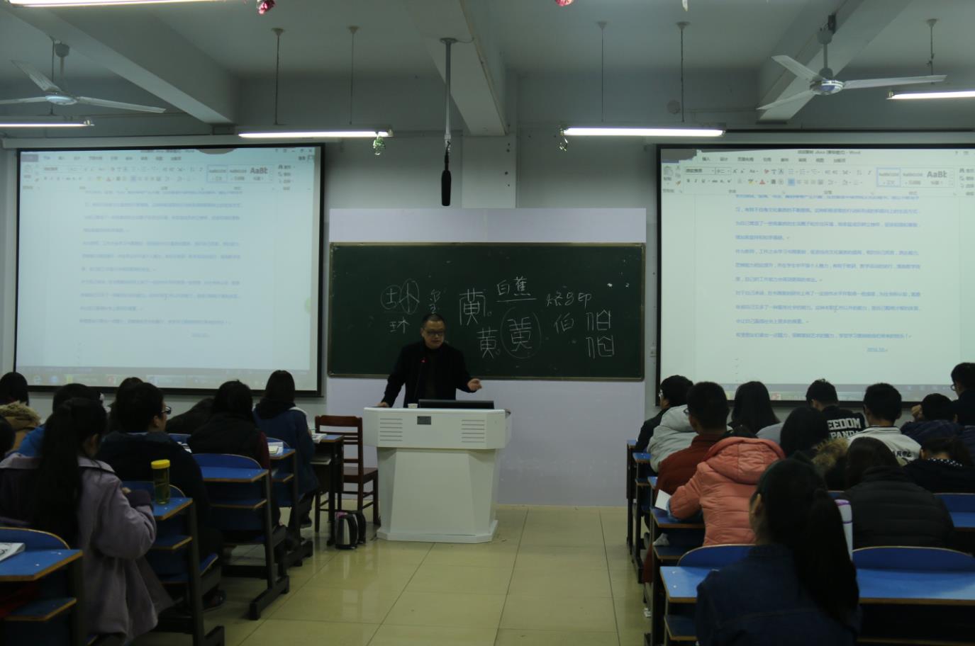 讲座围绕“篆刻的发展与欣赏”、“篆刻的两大经典”、“篆刻的趣味与魅力”三个方面有序开展。唐咏声先生结合自己多年的研究经验阐述了篆刻在古代的权力凭证、信件保密等方面发挥的重要作用,并讲述篆刻因时代更迭、地域差异等原因逐渐形成多元化的篆刻方式。他重点讲到,篆刻的乐趣不仅在于方寸之间和古人进行思想上的交流,更能融会贯通,助益教学。随后,他带领同学们欣赏了“宽可走马,密不容针”的殷商古玺印,庄重秀丽的秦官印和“方正寓圆,正中寓奇”的汉印等。唐咏声先生用诙谐幽默的语言带同学们领略了篆刻艺术的独特魅力,讲座现场座无虚席,气氛热烈。