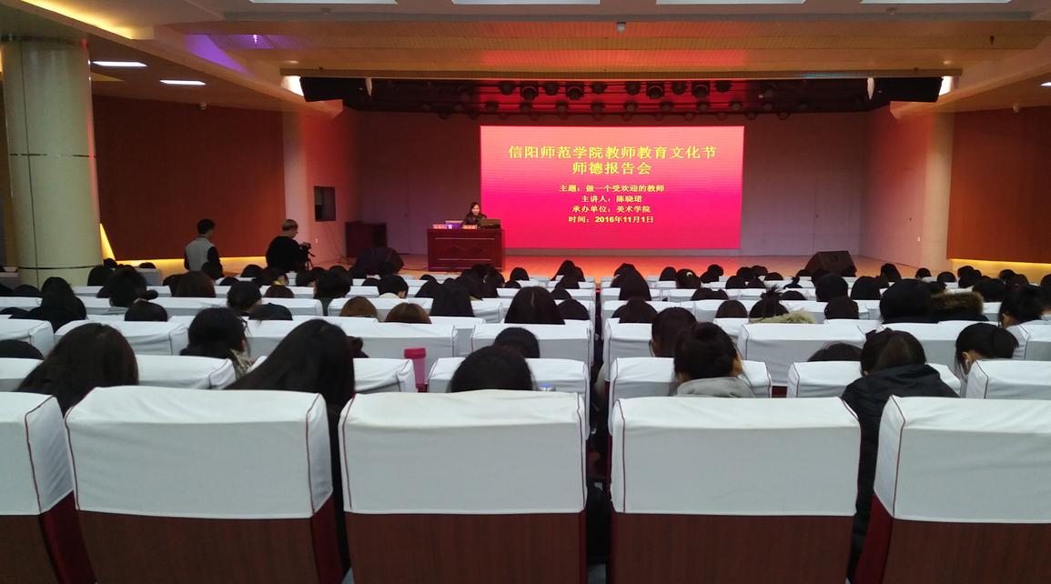 11月1日下午,由williamhill威廉希尔承办的2016年教师教育文化节师德报告会在理科楼报告厅成功举办,信阳市胜利路学校美术教师陈晓珺应邀为我院15级、16级全体学子作了主题为“做一个受欢迎的教师”的师德报告会。报告会由我院管艳老师主持。
