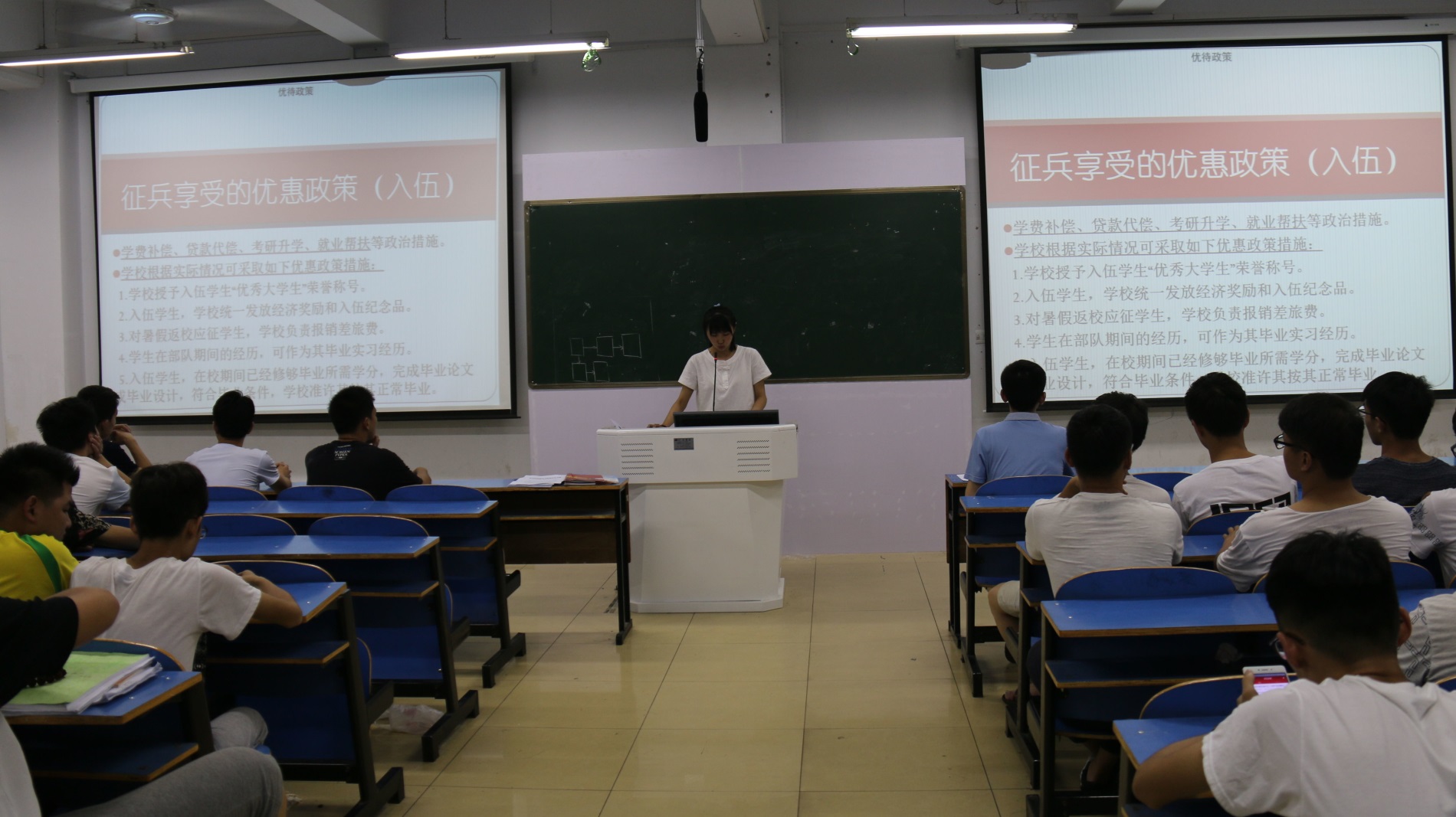 大会分为预备入伍学生代表发言、入伍视频展示及政策宣讲师生介绍、师生交流互动等三个主要环节。会议伊始,学院预备入伍学生代表郭帅帅上台发言。他从小立志入伍参军,考上大学后更是积极号。同学们听完他的发言,热血沸腾,报以热烈的掌声表示支持与认同。随后,学院学子张洁苹就入伍的学费补偿、贷款代偿等优惠政策及应征入伍的途径作了详细的介绍,并热情引导和激励优秀大学生参军入伍。在师生交流提问环节中,施远就学生对征兵的认识和想法等作出解答。施远总结大会时指出,大学生参军入伍是使命的召唤,也是个人难得的一次经历,希望同学们积极响应号召,投身军营。大会在热烈的掌声中结束。