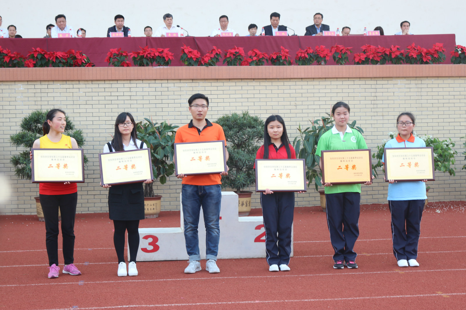 29日下午,信阳师范学院第三十五届春季运动会在西操场完美闭幕。校领导为获奖单位依次颁奖。我院荣获健美操二等奖、趣味运动会二等奖的优良团体成绩。赛出了水平、赛出了风格、赛出了精神。在欢呼声中,齐城宣布信阳师范学院第三十五届春季运动会胜利闭幕。