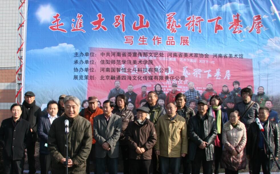 11月27日上午,由美术学院承办的“走进大别山,艺术下基层”中国油画名家写生作品展开幕式在艺术楼前举行。校党委副书记高建社,信阳市委宣传部长焦豫汝,著名美术教育家、油画家、中央美术学院教授苏高礼,河南省美术家协会副主席、河南省美术馆馆长化建国,东北师范大学美术学院院长、教授、博士生导师郭晓光,河南省美协理事、中原工学院教授王刚,信阳师范学院党委宣传部部长丁少锋及15位中国当代具有较强影响力的艺术家出席了开幕式。开幕式由美术学院副院长张伟主持。