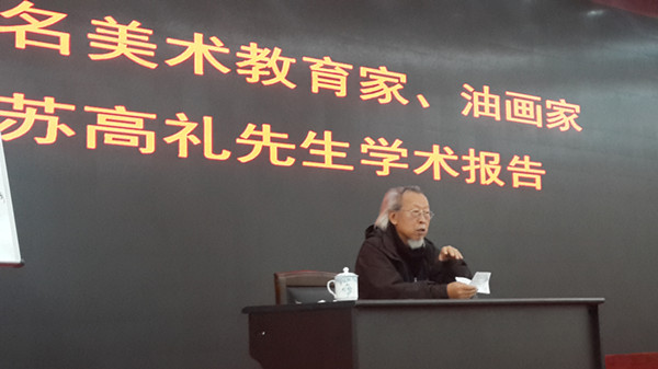 报告会中,苏高礼先生告诉大家,要想画好就必须清楚什么是美,怎样创造美。掌握平面结构的造型,富有生命力、动感与神韵。在此之前,我们首先要做的就是需要掌握基础知识,如:解剖、透视原理、明暗规律等。对于形象的再创造,苏高礼先生强调,不是画像,而是再创造,写和画不是描和抄。运用冷暖、黑白灰等色彩的对比和协调在画面中创造一个意境,体现一种情感。报告会最后苏高礼先生告诉同学们要想把自己培养成为一个真正的艺术家就必须具备生活、文化修养、技术,并要有为了艺术而奉献的精神。会上,在座的大家都认真的记录笔记,品味大师的经验之谈。报告会结束后苏高礼先生还特意为我院油画专业老师进行了作品点评,给出自己的意见和建议,老师们都表示受益匪浅,吸取了不少的经验。