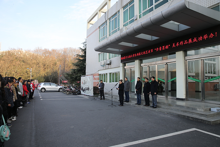12月18日,我校第十五届大学生科技文化节“丹青墨韵”美术作品展开幕式在艺术楼门前隆重举行。校党委宣传部部长丁少锋,学工部部长岳宗德,教务处副处长祁传达,研究生处处长李全亮,校团委书记王建旭,美术学院党委书记周子良、副书记李孝民,各院系教师代表及百余名学子共同参加了开幕式。开幕式由李孝民主持。 开幕式上,李孝民首先介绍了出席嘉宾,并对我院承办本次活动表示感谢。随后,丁少锋致开幕词,对各单位的积极配合与众位师生的踊跃参与表示衷心感谢,并预祝“丹青墨韵”美术作品展取得圆满成功。开幕式结束后,众人共赴展厅欣赏优秀作品。