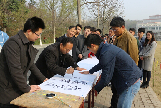 在李孝民的陪同下,王建旭和赵明民一同参观了活动现场。赵明民高度称赞了参赛选手饱满的热情,并泼墨书写了“龙飞凤舞”四个大字,借此鼓励大学生再接再厉,不断取得更大的进步。