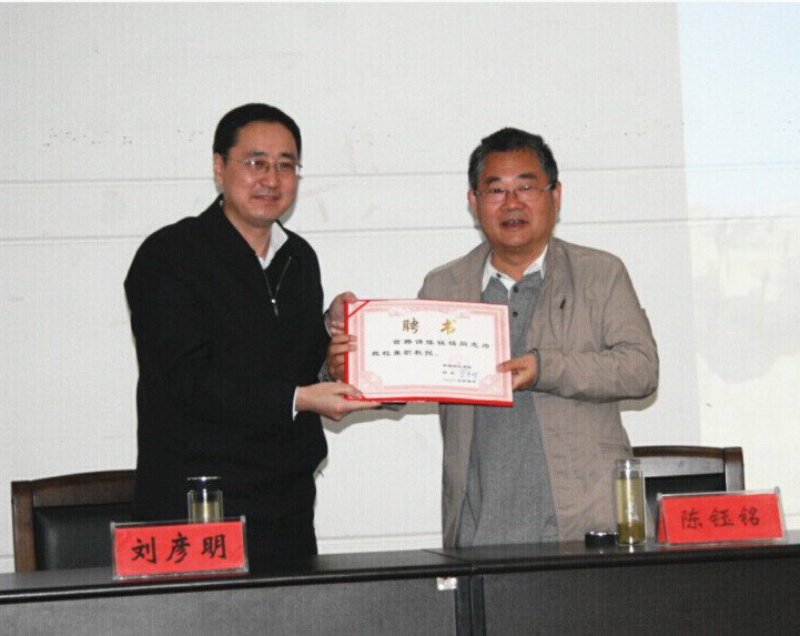 首先,美术学院院长刘根货对陈钰铭先生的基本情况作了简要介绍,信阳师范学院副校长刘彦明对画家陈钰铭的到来表示热烈欢迎,并向陈钰铭先生颁发兼职教授聘任书。