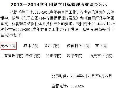 6月24日,校团委组织相关部门对全校各单位2013——2014学年的共青团工作进行全面总结考评,美术学院团总支在全校21个院系中脱颖而出,取得第一名的优异成绩。本年度,美术学院团总支克服学生工作人手不足等困难,带领美术学院青年学子,辛勤努力、踏实奋进,在学院领导班子及全体师生的关怀支持下取得历史性的好成绩!